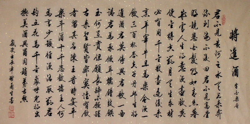 第二句“君不見高堂明鏡悲白發(fā),朝如青絲暮成雪。” 這句話用了排比來呼應(yīng)第1句,意思要表達(dá)人生苦短,時光匆匆,兄弟們,喝吧,你看早上照鏡子還是一頭黑發(fā),晚上就變白了。 前兩句又是時光不會倒流,又是人生苦短,開篇立意一起,目的就是要你喝酒,而且要及時喝酒。不得不說李白勸酒,勸出了高水平。 接著他又說“人生得意須盡歡,莫使金樽空對月。”得意的時候要盡情的歡樂,喝吧喝吧,別讓壇中美酒白白放在那里了。前三句,只字不提酒,句句讓你喝。 “烹羊宰牛且為樂,會須一飲三百杯?!薄皶殹本褪潜仨?,一定要的意思。這句話一定要把“烹”字和“宰”以及“三”字發(fā)重音,重重的大聲讀出來,就像咱們喝酒劃拳一樣,才能讀出李白當(dāng)時的心情。這句話意思是你要么不喝,要喝酒喝三百杯,當(dāng)然咱們中國詩詞里的數(shù)字都喜歡用夸張手法。不過這氣勢當(dāng)時就嚇壞了在座的兩位朋友。 “岑夫子,丹丘生,將進(jìn)酒,杯莫停!”岑夫子就是岑勛,丹丘生叫元丹秋,都是李白的好兄弟,好朋友,這兩位一聽完上一句就趕緊把酒杯放下,真喝不了了,剛放下酒杯就被點(diǎn)名,你可以腦補(bǔ)一下李白一手拿酒,一手指著這兩位的畫面,你這兩個家伙,杯子端起來,快喝酒,不要停! “與君歌一曲,請君為我傾耳聽?!边@又是大家熟悉的環(huán)節(jié)了,吹完牛皮,熊完不喝酒的人,接下來就是才藝表演環(huán)節(jié)了,誰還沒經(jīng)歷過這種場面,那你一定是太年輕了。 接下來是他唱的歌?!扮姽酿傆癫蛔阗F,但愿長醉不愿醒?!薄扮姽酿傆瘛笔谴腹γ毁F,說功利祿都不重要,都沒用,我只想喝醉。 “古來圣賢皆寂寞,惟有飲者留其名。”從古至今的圣賢,死了之后就籍籍無名了,沒有人記得了,“寂寞”了,只有喝酒的人的名字才會被人記得,兄弟們,你要想永垂不朽流芳百世,就跟我一起喝酒吧! 這時候就已經(jīng)喝嗨了,開始說歪理,講胡話了。 “主人何為言少錢,徑須沽取對君酌?!痹趺磿]錢呢?現(xiàn)在談什么錢呢?沒勁!只管喝酒! “五花馬。千金裘,呼兒將出換美酒?!边@里的“兒”可能是他的兒子,也可能指侍童。李白說:“小子,去把我的馬,我的袍子拿去當(dāng)了!給老子換酒來!”看來他是真的沒錢了,也印證了前面那句“千金散盡還復(fù)來”是吹牛的。 “與爾同銷萬古愁”,充滿了感情 色彩,也是這首勸酒歌流傳百世的點(diǎn)睛之筆
